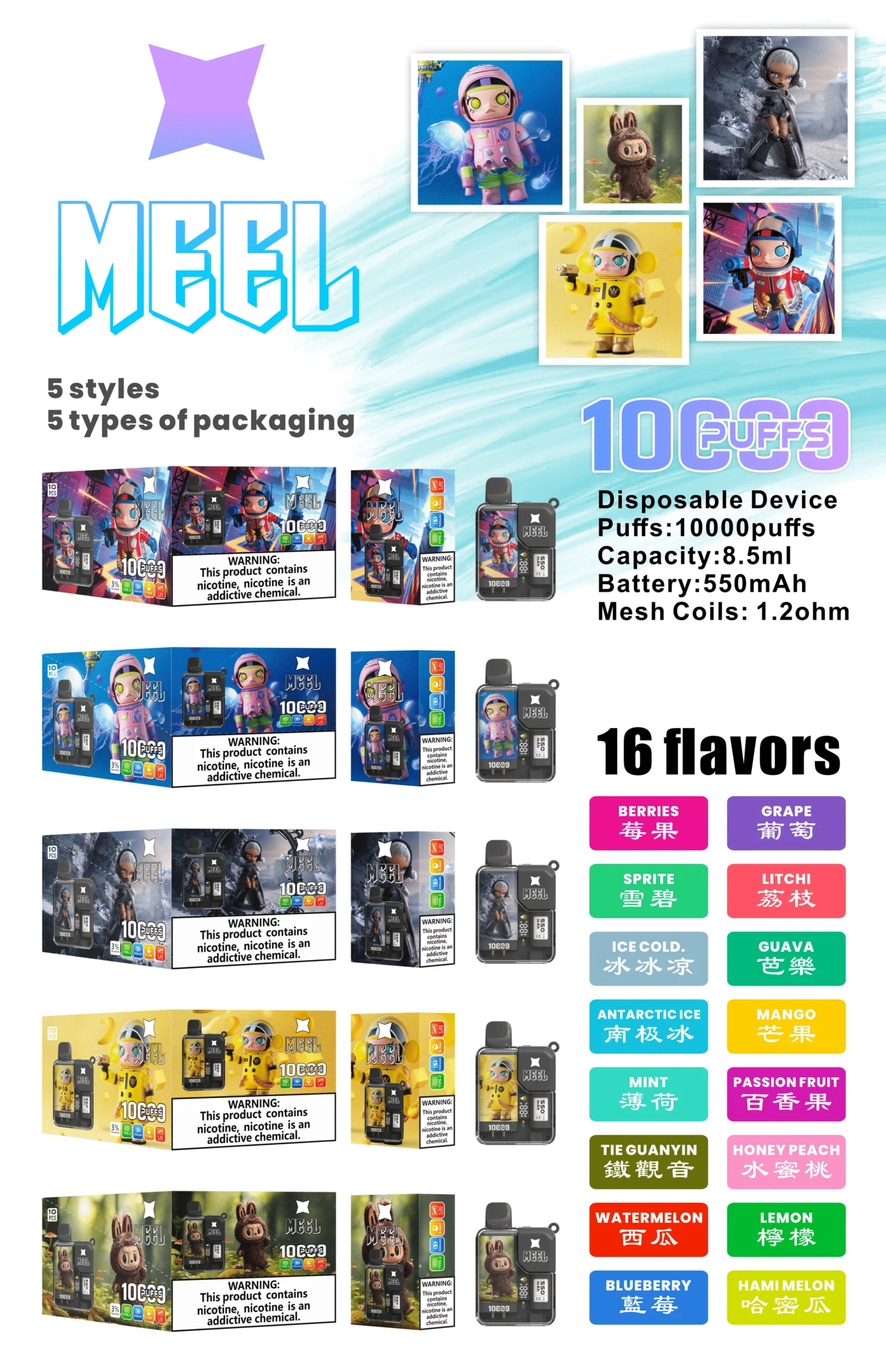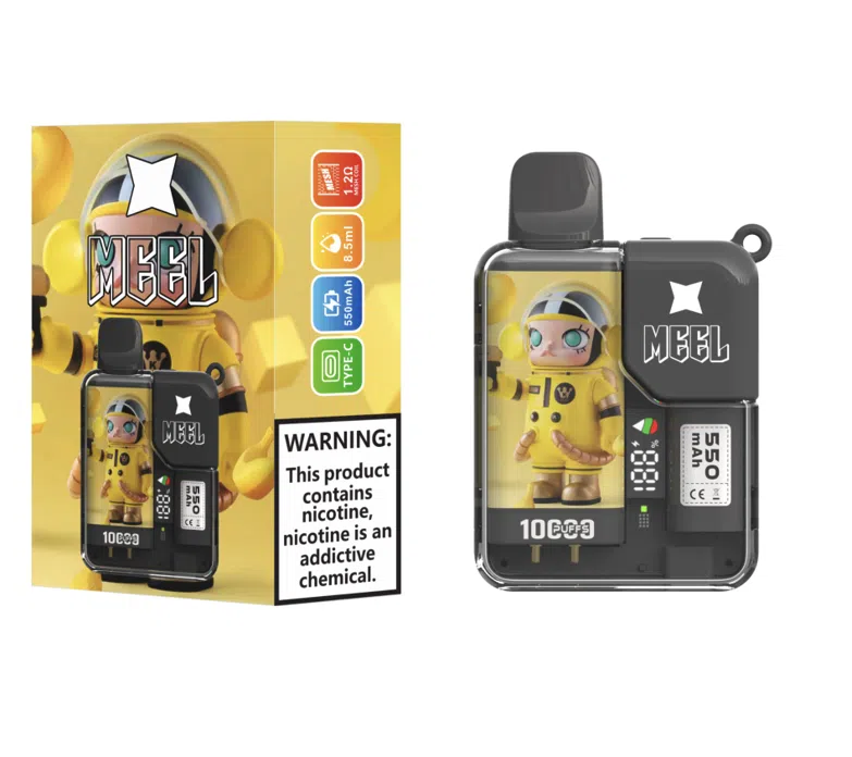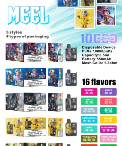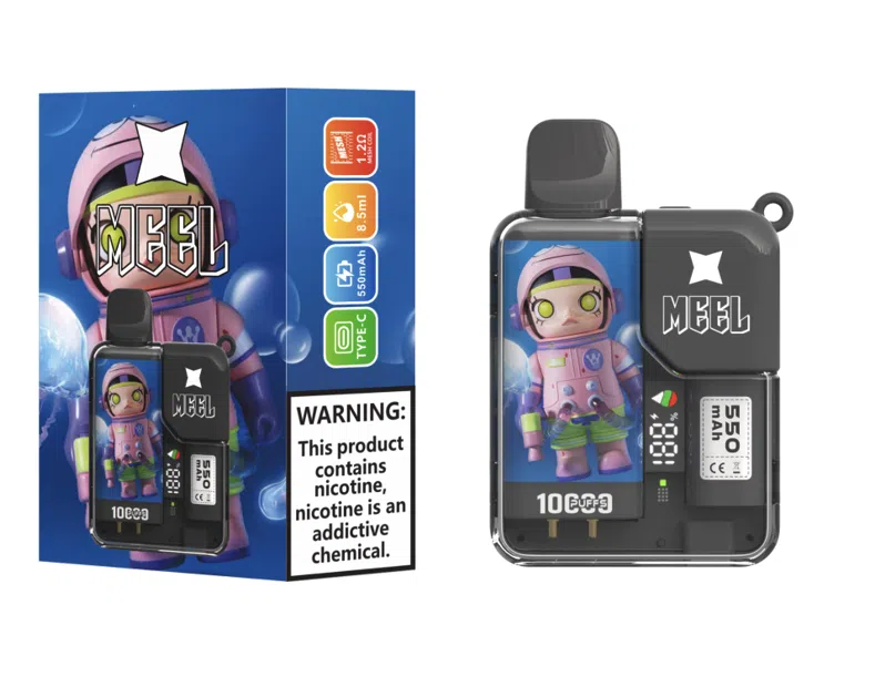 MEEL 10000 Puffs 泡泡瑪特聯名電子煙,結合 Molly、Skullpanda、Hamcus 等人氣角色設計,擁有 10000 口超長續航、550mAh 電池與 8.5ml 煙油容量,一次性使用,方便又時尚,限量收藏必備。